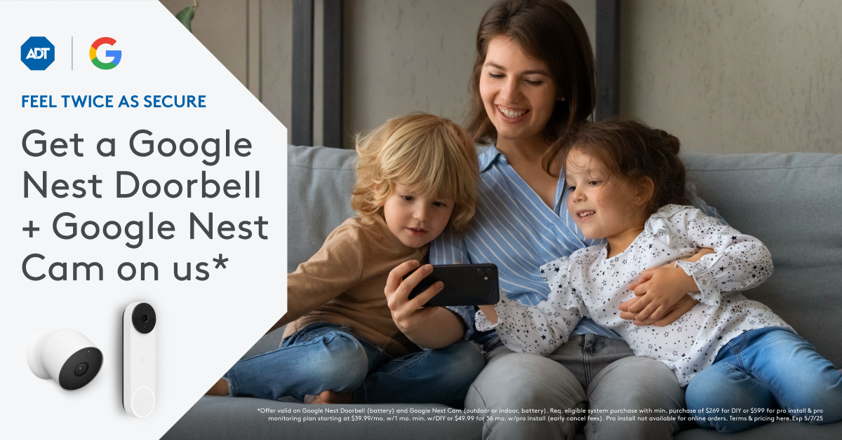New ADT customers only. Offer includes one (1) Google Nest Doorbell (battery) and one (1) Google Nest Cam (battery) at no cost with qualifying Smart Security System purchase. Max discount: $559.98 for pro install or $359.98 for DIY. Professional monitoring required. Early termination fees apply. Features may require Wi-Fi, internet, a Google Account, and the Google Home app linked to your ADT+ app. Limit one offer per customer. Not valid with other promotions. Shipping not available in HI or AK. Google Attribution: Google, Nest Doorbell, and Nest Cam are trademarks of Google LLC.